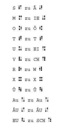 Hierfür kommen jedoch nicht alle Buchstaben in Frage, denn nur einige Buchstaben ergeben um 180° gedreht, also auf dem Kopf stehend, einen anderen Buchstaben in Brailleschrift.